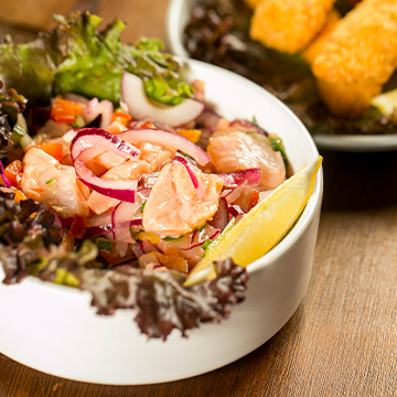 Salmón (150g), zumo y ralladura de naranja y limón, aceite de oliva, cebolla morada, pimiento rojo, pepino, salsa spicy.